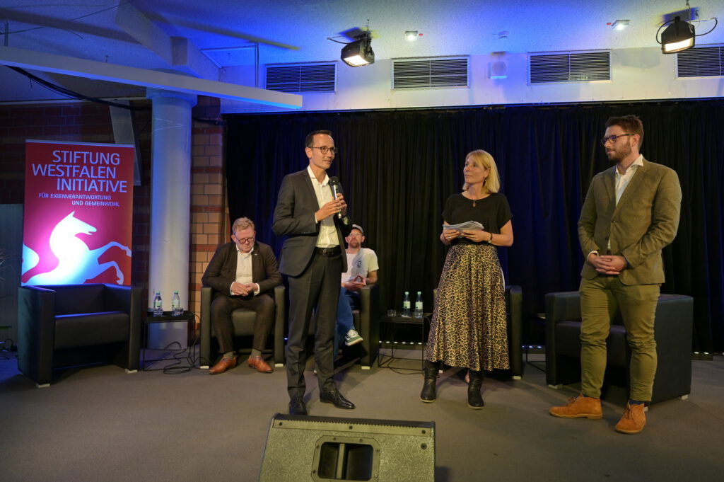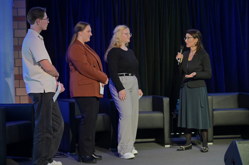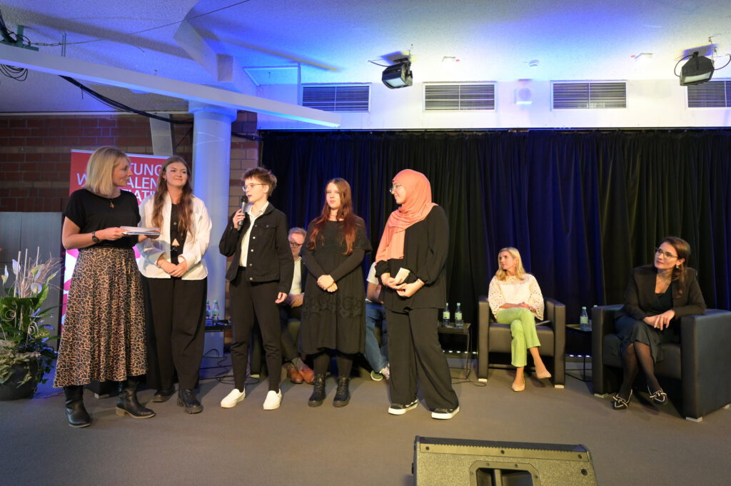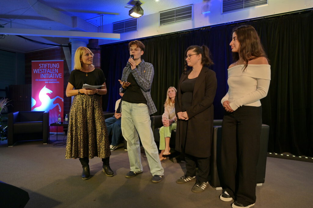 Gemeinsam mit Politikerinnen, Unternehmern und internationalen Organisationen diskutierten die jungen Menschen, welche Wege zu einem friedlichen Europa führen können und welche Verantwortung jede und jeder selbst dabei trägt. Den Fragen der Jugendlichen stellten sich unter anderem Staatssekretärin Gonca Türkeli-Dehnert, Dr. Andreas Hollstein (Polonia-Beauftragter des Landes NRW) und die beiden Unternehmer Mareike Boccola und Julius Dittmann.
